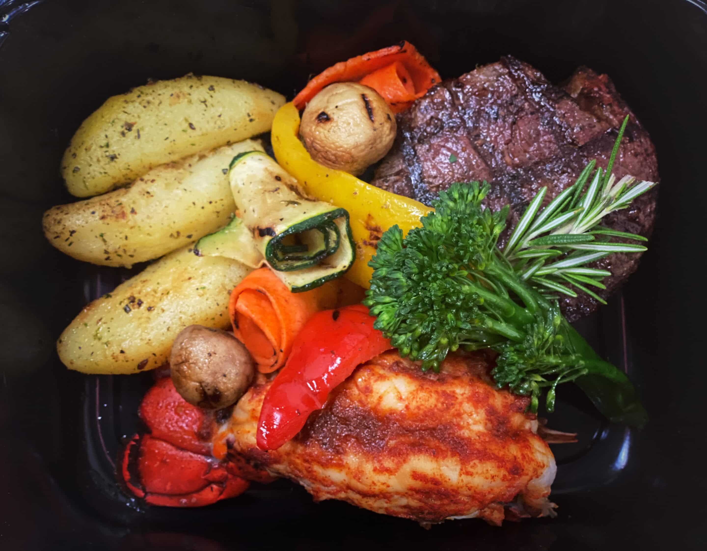 Beef tenderloin/lobster combination w chefs vegetables and roast potatoes